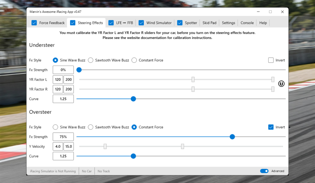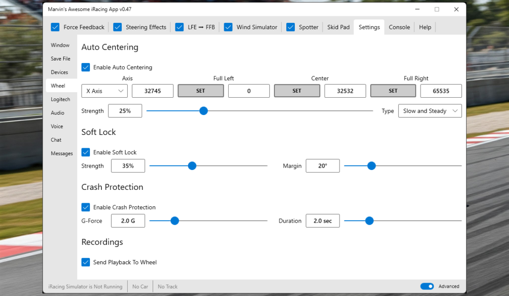 Steering effects: Oversteer and understeer warnings can be configured as sine wave pulses, sawtooth patterns, or constant force signals through the wheel. I personally keep these disabled – I prefer pure FFB without synthetic effects – but they’re there if you want them.